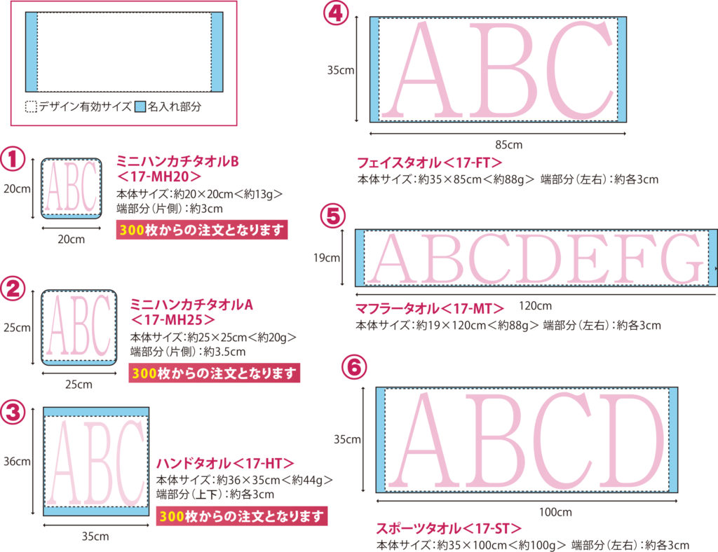 最小100枚~(ミニハンカチタオル・ハンドタオルは300枚~) 承ります。