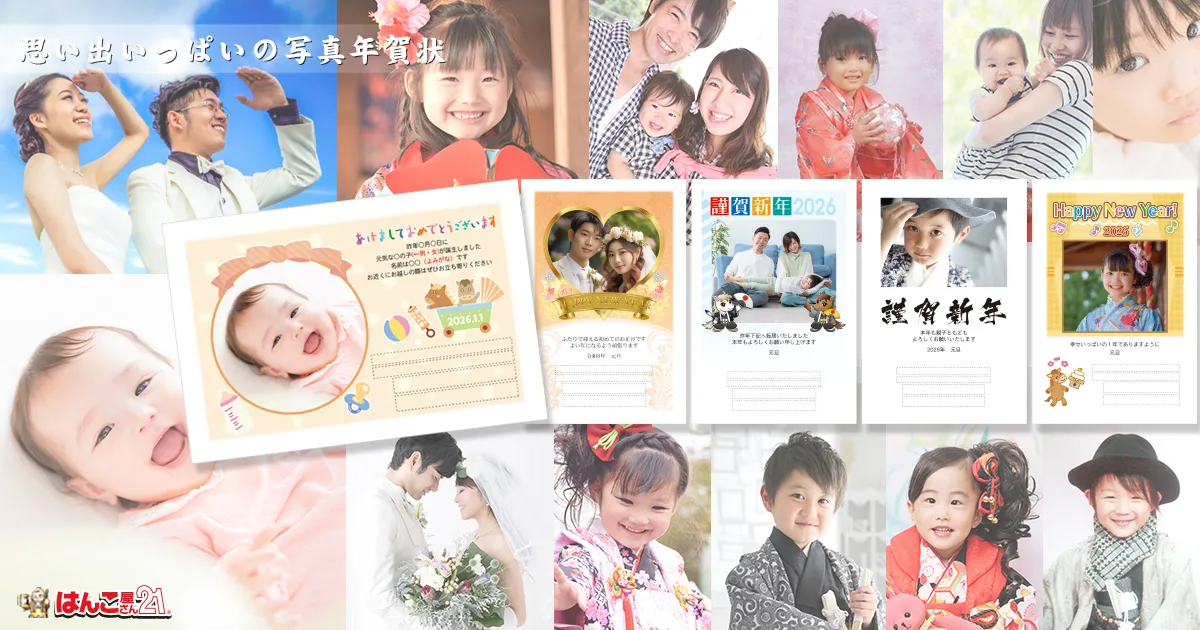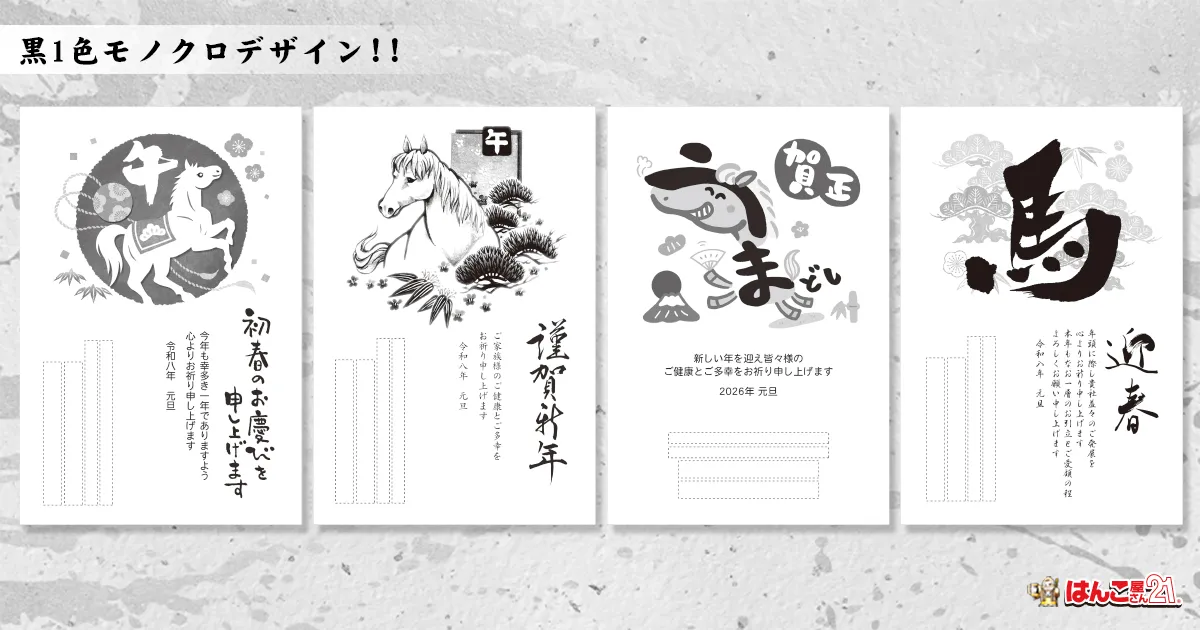 全国の「はんこ屋さん21」店舗にて、年賀状および喪中・寒中見舞いをお求め頂けます。デザイン豊かな約170種類よりお選び下さい。